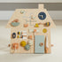 Keep baby busy with our plywood and solid wood Busy Board! 12 Super fun activities to help junior develop small motor skills and color recognition. They will be delighted by sound and tactile stimulation. Activities include maze, clock with moving hands, abacus, spinning toys, key that fits into the door with a surprise mirror inside, gears, and much more. Baby can play with the removable wooden birdie sitting in its nest. Can be played flat on the floor, or stand it up in 2 different positions. Busy, busy, busy!