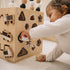 Time to start thinking outside the box with our Busy Box for babies. Baby will be busy sorting 12 shapes on one panel, playing with shapes abacus and gears on another panel, scooting vehicles across a track on a different panel, and lots of activities on the last panel. Add a beaded maze on the top to complete this square deal. Made of solid wood and plywood, plus non-toxic painted graphics, our Busy Box is a great toy for curious babies. Helps develop small motor skills, and stimulates the senses. Busy, busy, busy!